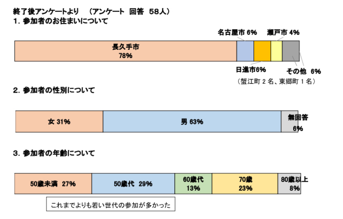 活気のある講演会が開催できたのは、来場された方々、長久手市役所の皆様、ハートフルハウスと愛知たいようの杜の方々、愛知医科大学病院の對馬さん、陶生病院の渡辺さん、やまびこ長久手の佐光さん、長久手支部の先生方など関係の皆様のお力添えのお陰です。本当に有難うございました。